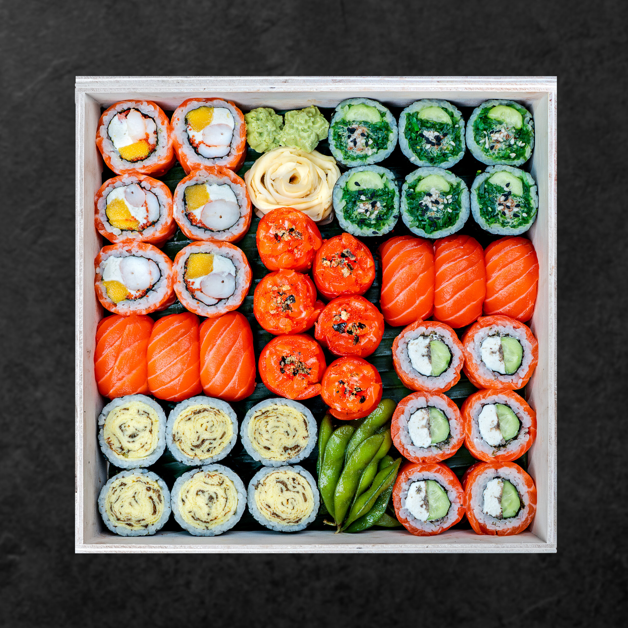 Philadelphia Salmon, Philadelphia Prawn, Maki Truffle Tamago, Tobiko Orange, Salmon Clean Salt, Maki Philadelphia, Cucumber Big, Hana Red Caviar (already include condiment truffle edamame, soy sauce, pickle ginger, wasabi).