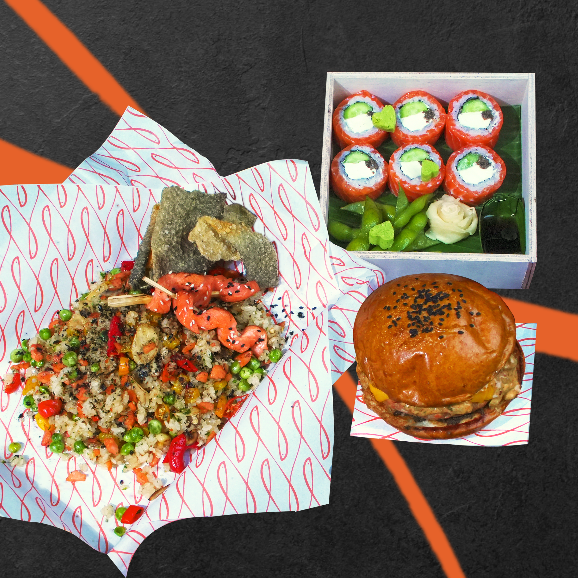 Sushi rice, Avocado, Baby cucumbar, Nori, Prawn, Mango, Tobiko, Salmon, Spring onion, Cimchi, Marinated cucumbar, Soy sauce, Wasabi, Spicy burger sauce