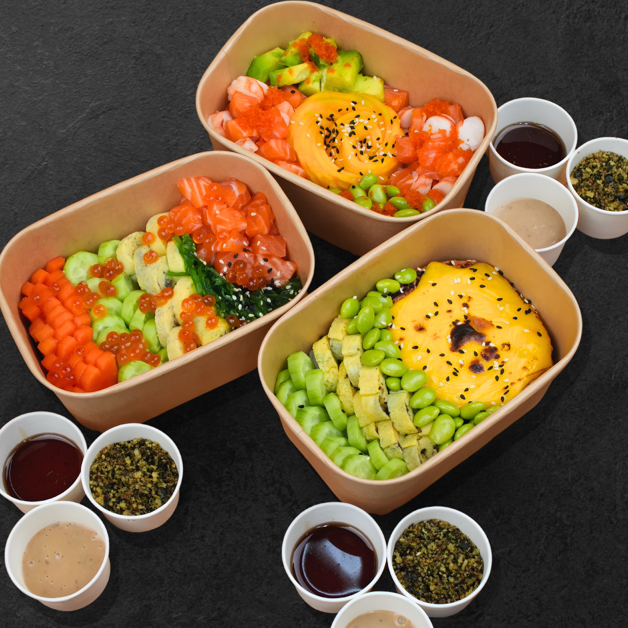 1. Truffle Salmon Poke Box 2. Salmon Prawn Poke Box 3. Saku Poke Box